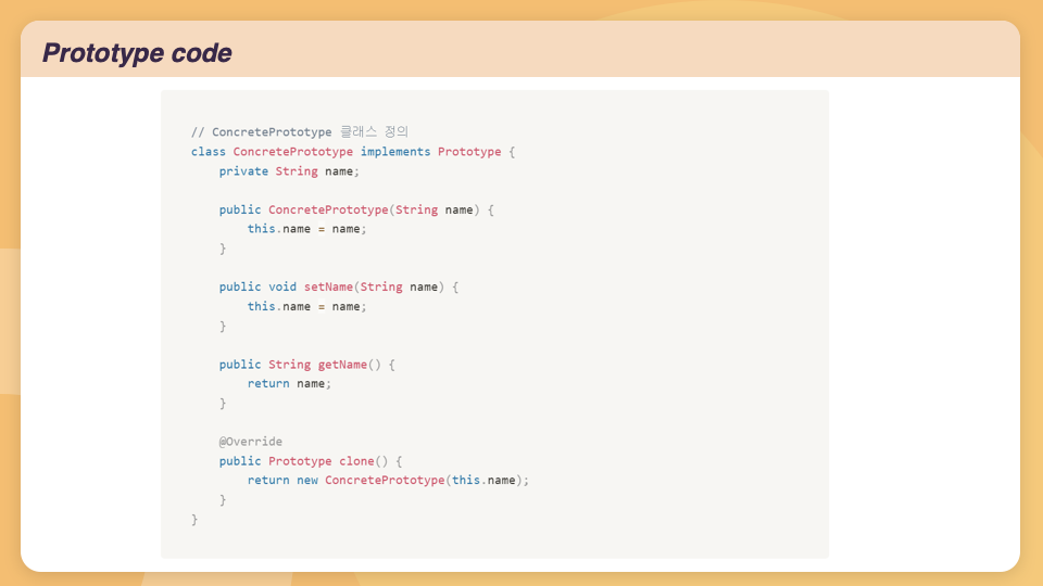 ConcretePrototype 클래스가 Prototype 인터페이스를 구현하여 clone() 메서드를 제공합니다. 생성자는 이름을 받아 초기화하며, setName과 getName 메서드는 객체의 이름을 설정하고 반환합니다. clone() 메서드는 현재 객체를 복제하여 새로운 객체를 생성하며, 이때 복제된 객체는 동일한 속성을 가집니다.