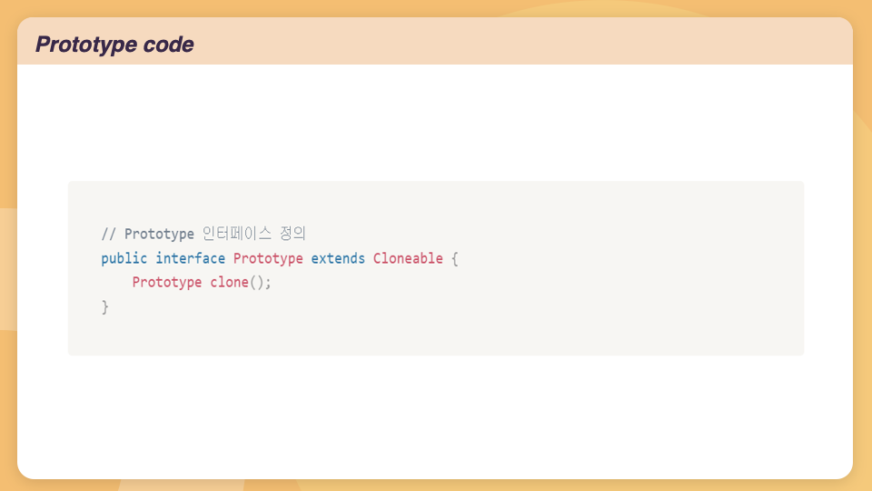 프로토타입 인터페이스는 cloneable을 구현하여 clone()메서드를 정의하고 있습니다.