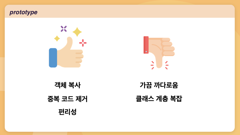 객체의 복제를 통해 빠르게 새로운 객체를 생성할 수 있어서 편리성과 효율성을 제공합니다. 객체를 복사하는 것만으로 다수의 객체를 만들 수 있기 때문에, 객체 생성과정이 간소화되고 코드의 가독성이 높아집니다.