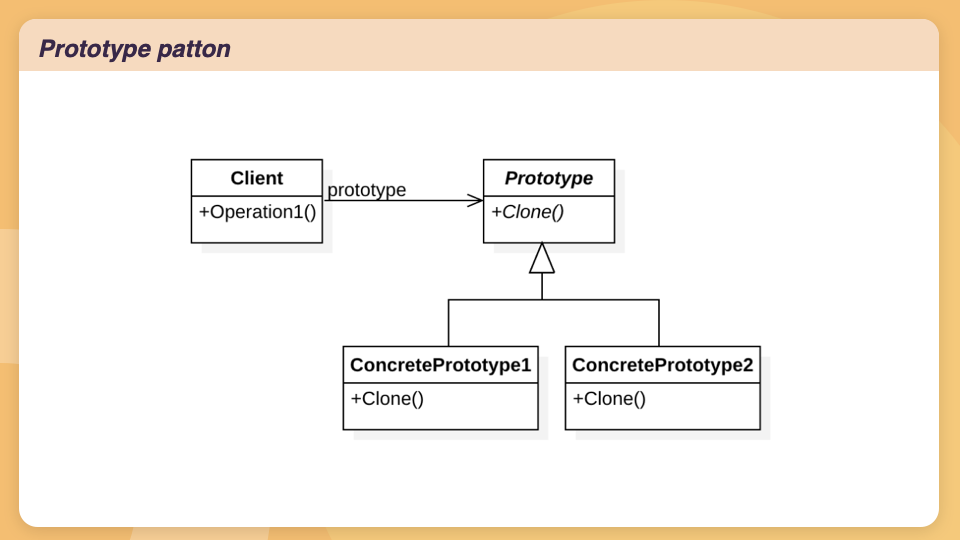 프로토타입 클래스는 일반적으로 인터페이스나 추상클래스로 표현되고, 객체를 복제하는 clone메서드를 정의하고, 실제 복제를 구현하는 콘크리트프로토타입클래스를 포함합니다.