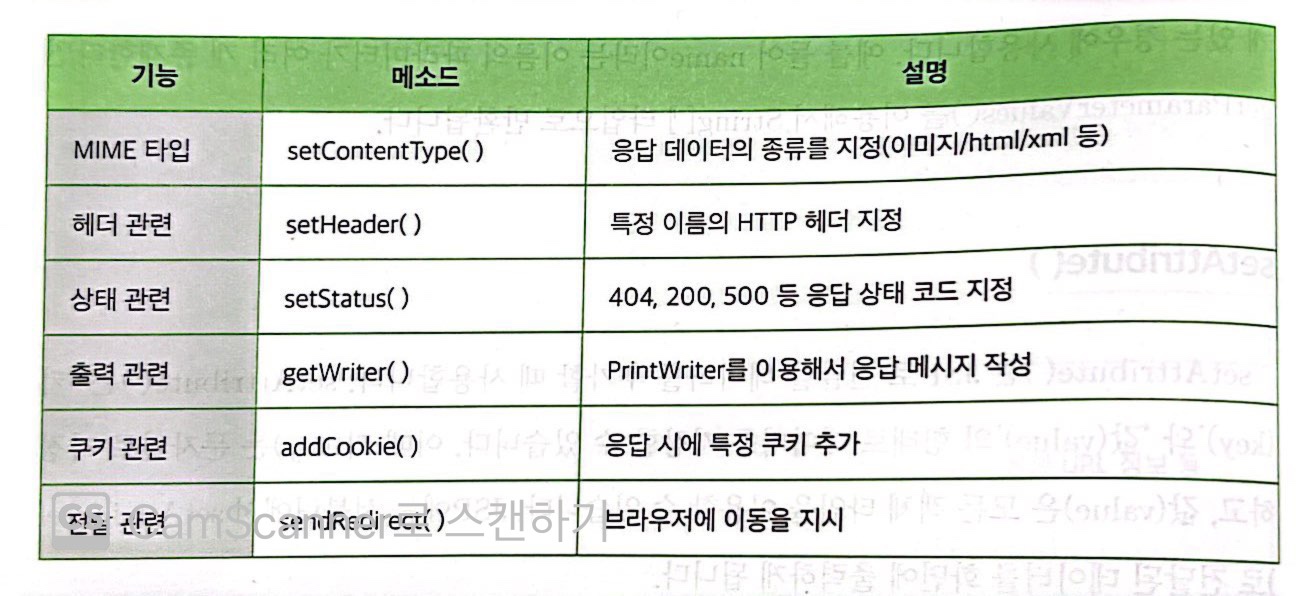 HttpServletResponse는 JSP에서 주로 처리되기 ㄸ ㅐ문에 서블릿 내에서 직접 사용되는 일은 많지 않고 주로 sendRedirect()를 이용하는 경우가 많다.