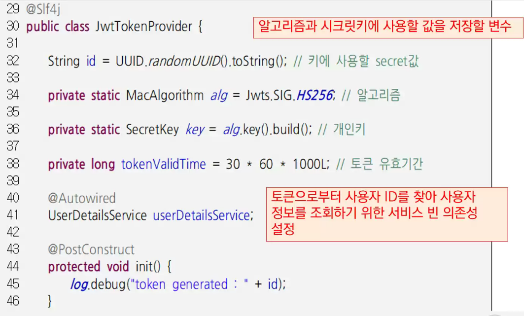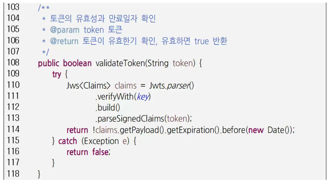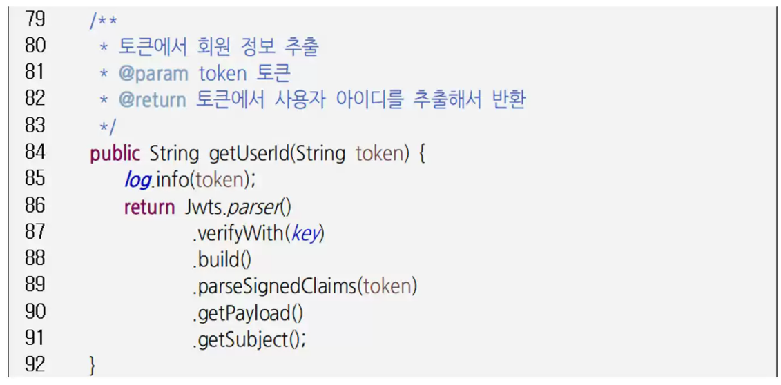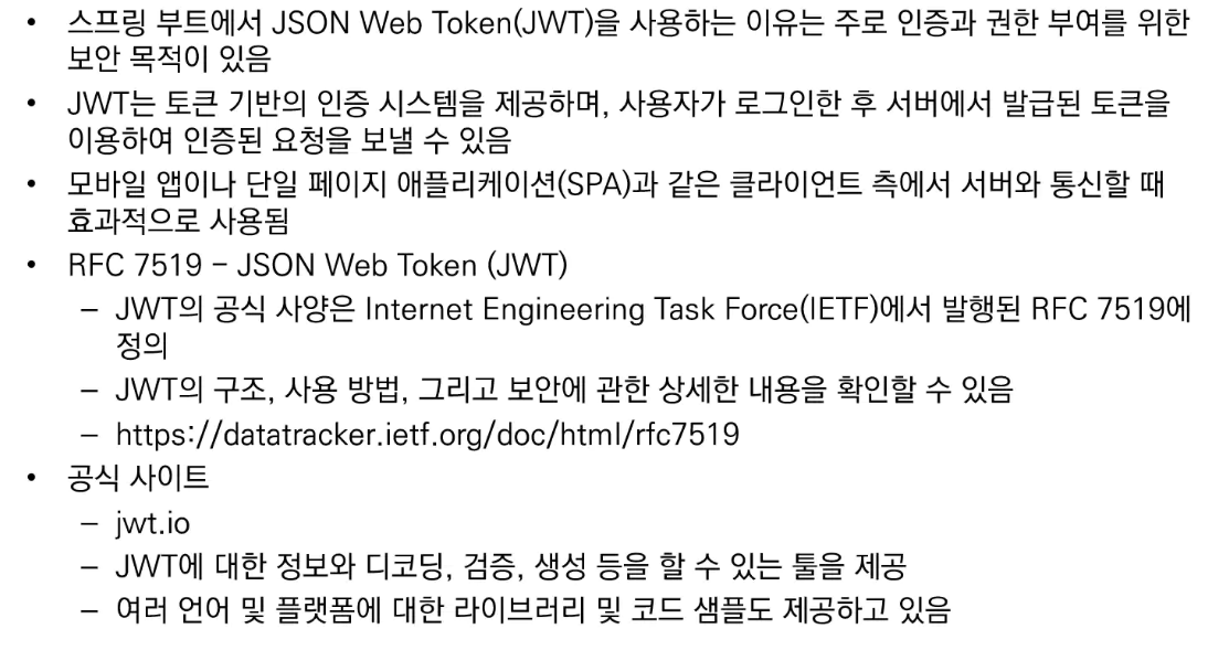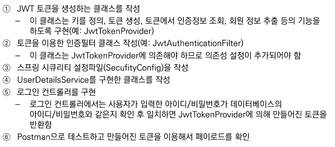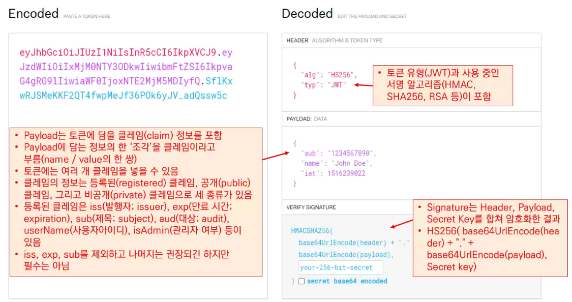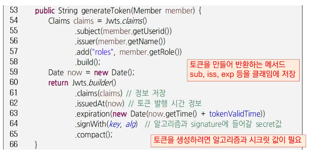 담아야할 것 : 알고리즘, payload에 담기위한 정보들 (iss, iat(issued at), sebject),(클레임 하나가 네임 벨류를 담는 조각),시큐리티 키도 필요