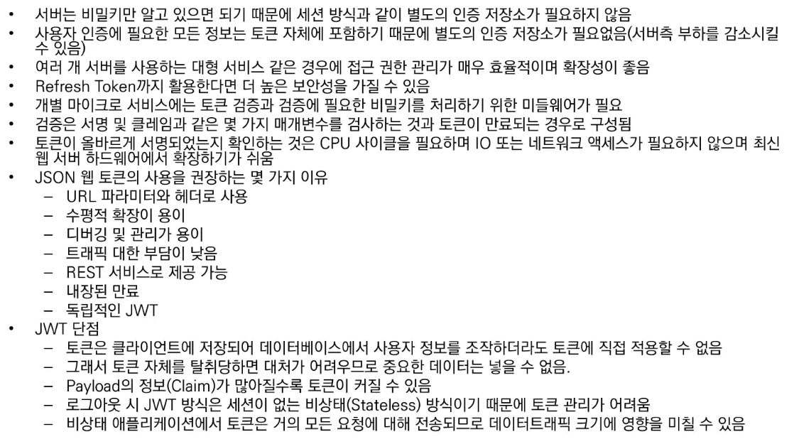 장점 : 서버는 비밀키만 알고 있으면 되기 때문에 세션 방식과 같이 별도의 인증 저장소가 필요하지 않음